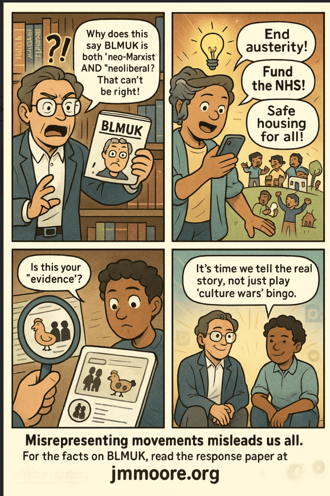 Whilst no-one would argue for accepting any organisation’s claims uncritically, or that it is not legitimate to challenge them, Hodgkinson et al.’s failure to engage with BLMUK’s stated aims is highly problematic. Either the authors failed to carry out the basic research task of reading the BLMUK website (or any other of their literature), or they did, and then chose to ignore their research. Instead of starting with an evaluation of BLMUK’s claims, Hodgkinson et al., present BLMUK as both ‘a neo-Marxist organisation’ (p. 89) and, simultaneously, responsible for ‘the reproduction of neoliberal ideology’ (p. 98). The identification of BLMUK as neo-Marxist is supported by a reference to an article in The Critic, a ‘contrarian conservative magazine … underwritten by Jeremy Hosking, a Brexiteer investment tycoon’ (Burrell, 2020). The article, by Nick Buckley, a former charity CEO and the Reform UK candidate for the Mayor of Greater Manchester, argues that BLM has ‘a neo-Marxist, anarchist, political agenda’ (Buckley, 2020). It was a conclusion he reached because ‘they put it on their website for the world to read’ (Buckley, 2020). Given the content of BLMUK’s website (see for example BLMUK, undated A, B and C) this is not an unreasonable conclusion, despite BLMUK’s claim that ‘we are not a Marxist organisation’ (BLMUK, undated B).